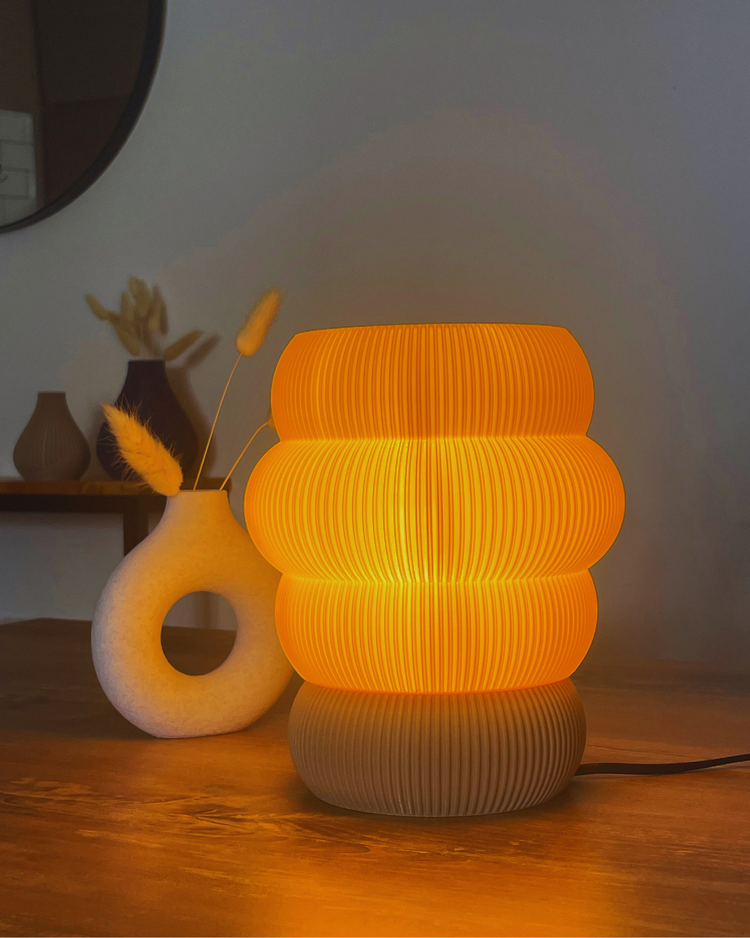 Un combo pensado para crear un ambiente cálido y armonioso en cualquier espacio. La lámpara Nido aporta una iluminación suave y acogedora, mientras que el florero Donut suma un toque moderno y minimalista ideal para decorar con flores secas.