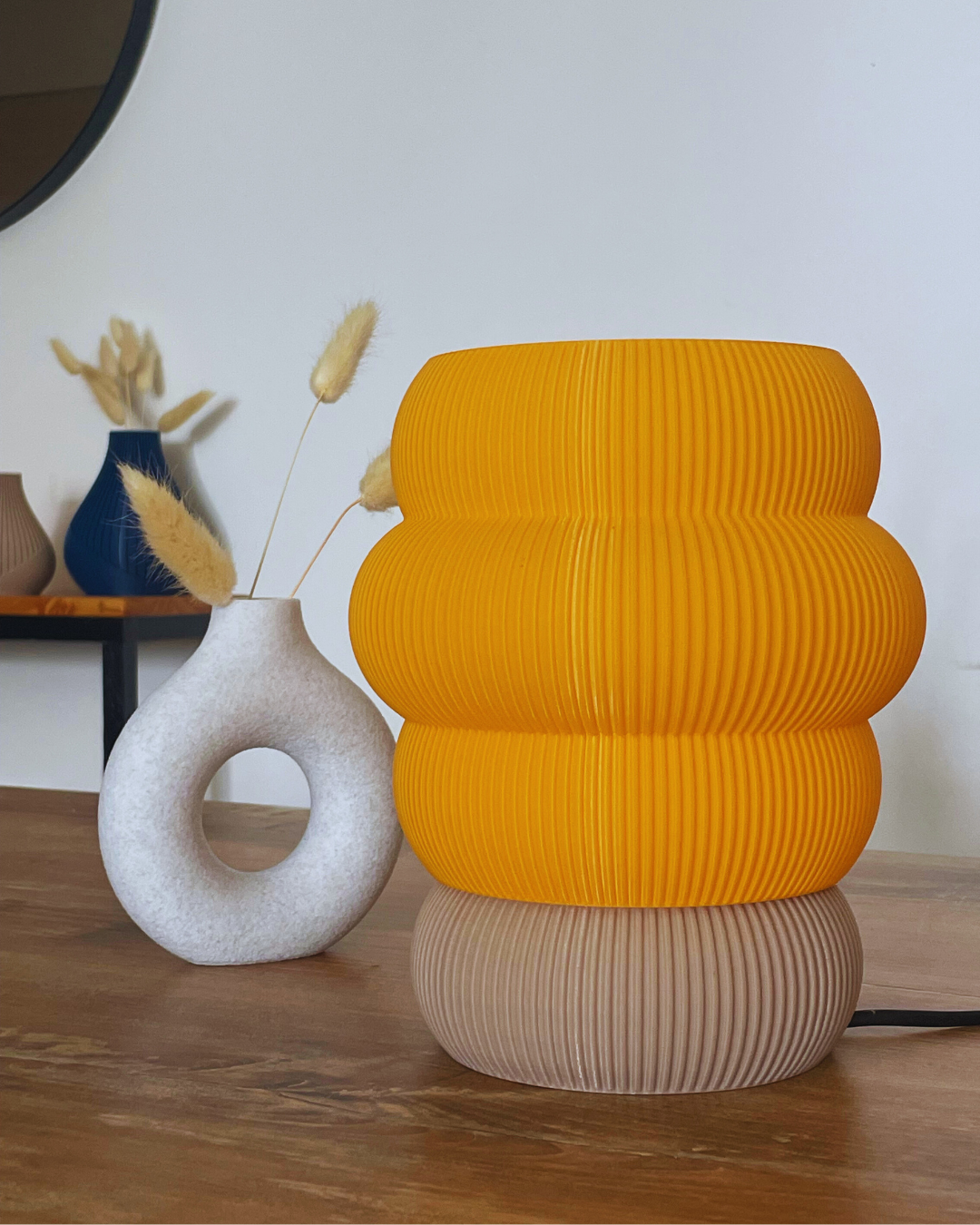 Ambas piezas están impresas en 3D, combinando diseño contemporáneo con texturas únicas que destacan en mesas, estanterías o mesas de noche.