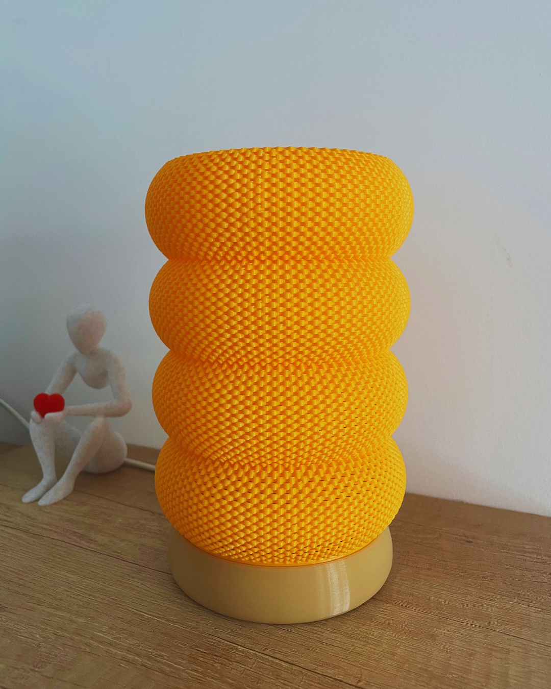 Lámpara de mesa con un diseño llamativo y fluido, compuesto por curvas envolventes que crean un efecto suave y repetitivo, como una nube segmentada Su forma y tamaño la hacen perfecta para destacar en cualquier ambiente.