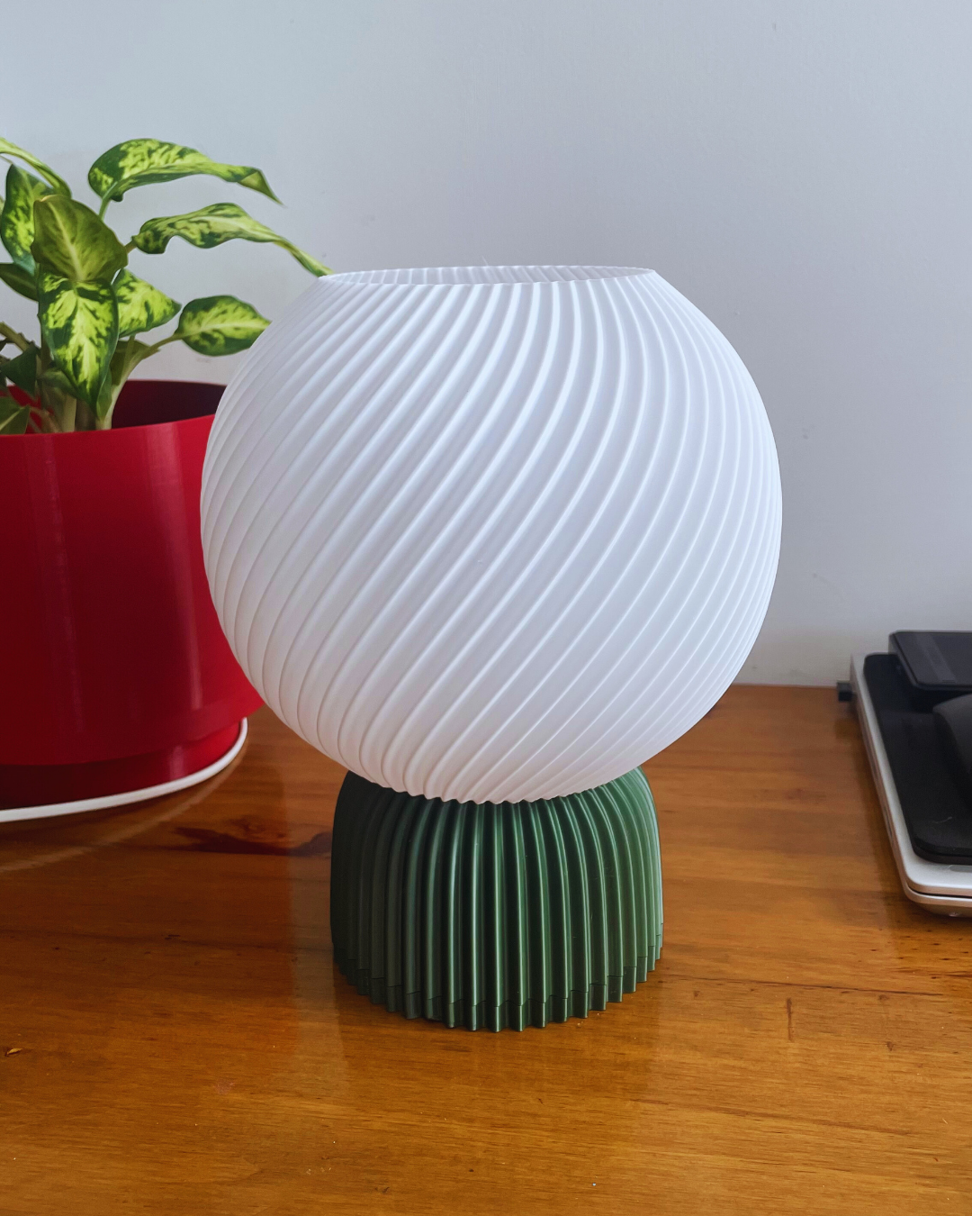 Lúmina es una lámpara de mesa con forma esférica y textura en espiral, ideal para decorar espacios con un toque moderno y cálido.