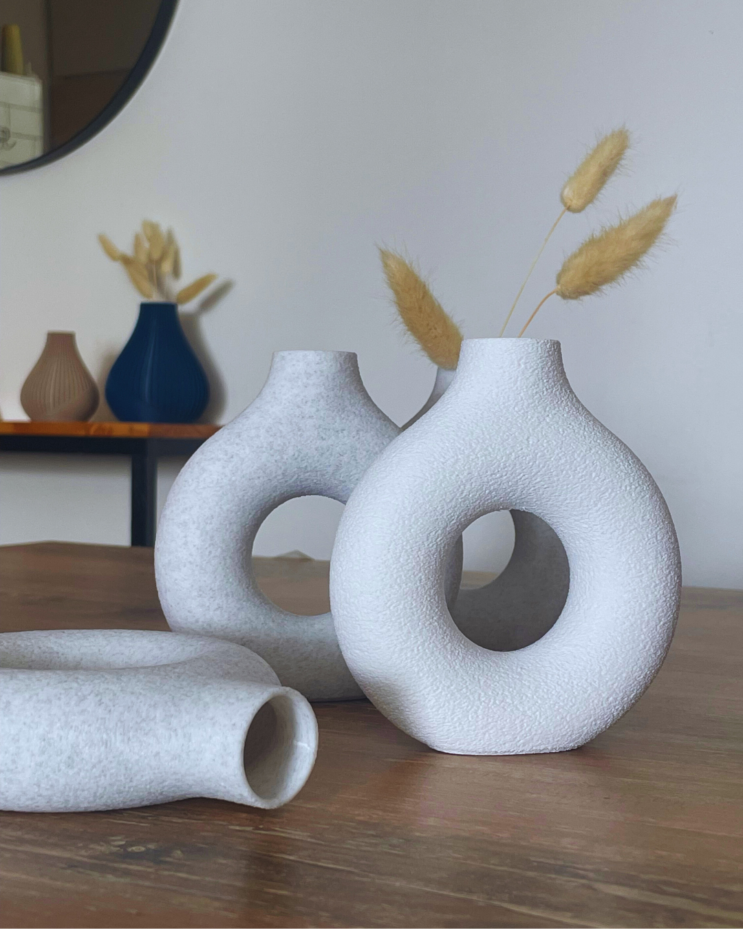 Florero decorativo con diseño moderno tipo donut, ideal para sumar un toque minimalista y elegante a cualquier espacio del hogar. Su forma orgánica lo convierte en una pieza que destaca tanto con flores como sin ellas.